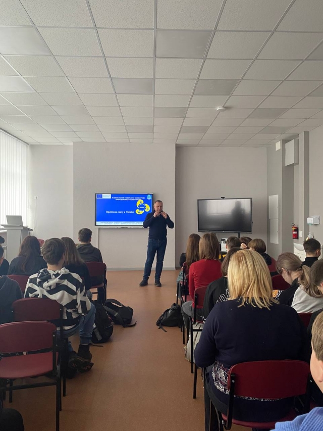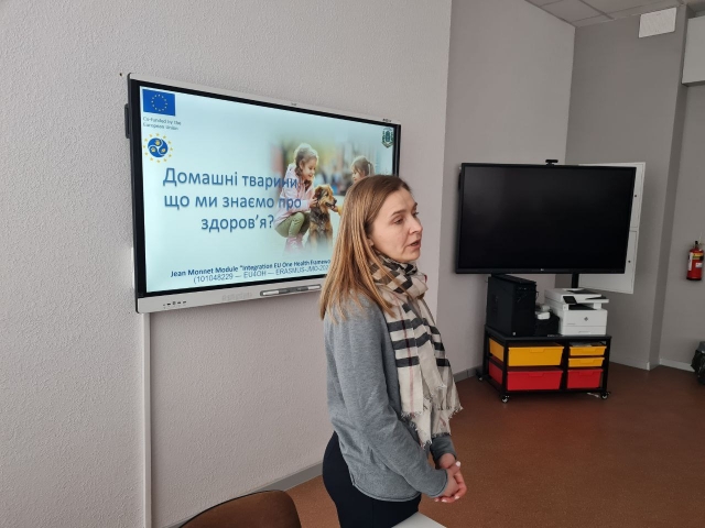 Associate Professor of the Department of Veterinary Hygiene Mariia Galaburda and Associate Professor of the Department of Epidemiology, Microbiology and Virology Oleksandr Martyniuk met with 7th grade students of Kyiv Gymnasium No. 315 as part of the Jean Monnet project "Integration of the EU One Health Policy and Framework in Ukraine" and held an educational event on certain aspects of health care while communicating with animals, including pets.