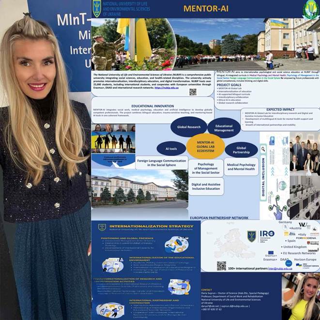 During the workshop, Daria Suprun presented the MENTOR-AI project (Mental Health, Inclusion, and International Outreach with Digital Assistive AI Resources), aimed at developing academic staff competences in international teaching, digital transformation, and the use of Digital Assistive AI in mental health education.