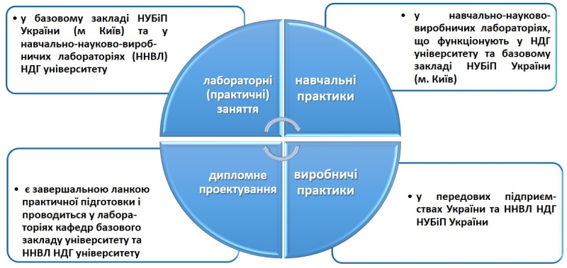 Бази практичного навчання. Базами практичного навчання студентів (слухачів) НУБіП України є навчальні, навчально-наукові, навчально-науково-виробничі лабораторії базового закладу університету (м. Київ), його відокремлених підрозділів (ВП), і у першу чергу ─ НДГ університету, де проводяться лабораторні й практичні заняття, навчальні, технологічні, науково-дослідні, переддипломні та інші практики у галузях: рослинництво, тваринництво, переробка та зберігання продукції рослинництва, технології виробництва біодизелю, розведення тварин та риби, розробка методів діагностики та профілактика хвороб тварин, технології ремонту, обслуговування та випробування сільськогосподарської техніки, лісознавство, деревообробна промисловість, мисливська справа та її правове забезпечення, економіка, облік, маркетинг та менеджмент в аграрній сфері виробництва тощо.