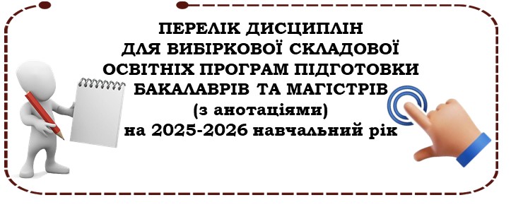 Вибіркові освітні компоненти студенти обирають самостійно із затвердженого Переліку вибіркових дисциплін, що пропонується Університетом, формуючи таким чином власну індивідуальну освітню траєкторію.