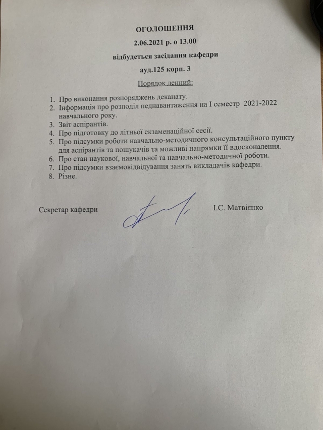У середу 2.06.2021 р. о 14.00 відбудеться онлайн засідання кафедри.