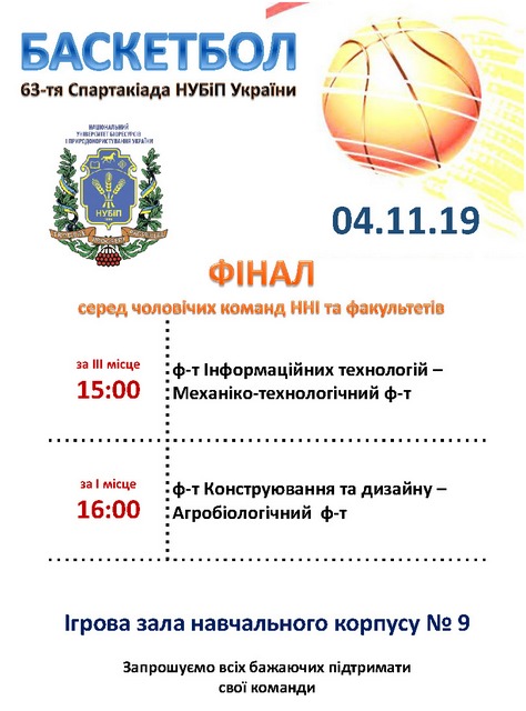 Запрошуємо 04 листопада 2019 року на фінальні ігри з баскетболу серед чоловічих команд ННІ та факультетів в рамках 63-ї спартакіади студентів НУБіП України!!!
