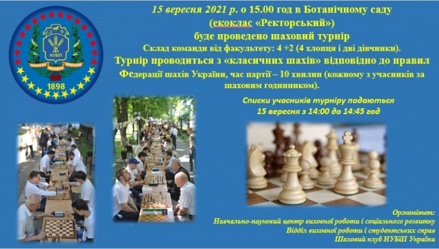 До участі у шаховому турнірі запрошуються студенти першого курсу 2021 року вступу. Захід відбудеться 15 вересня 2021 року в Ботанічному саду НУБіП України, екоклас «Ректорський». Список складу команд (завірений підписом декана або директора і мокрою печаткою), капітани команд представляють перед початком змагань, суддівській колегії і оргкомітету турніру, головному судді та головному секретарю. Заявки на участь у турнірі подаються під час реєстрації (15 вересня, середа з 14:00 до 14:45 год).