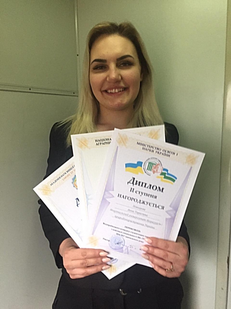 За результатами ІІ туру Всеукраїнського конкурсу студентських наукових робіт у галузі наук «Зоотехнія» студентка 4 курсу Анна Новицька була визнана переможцем та нагороджена дипломами ІІ ступеня від Міністерства освіти і науки України, Національної академії аграрних наук України та Академії наук вищої освіти України.