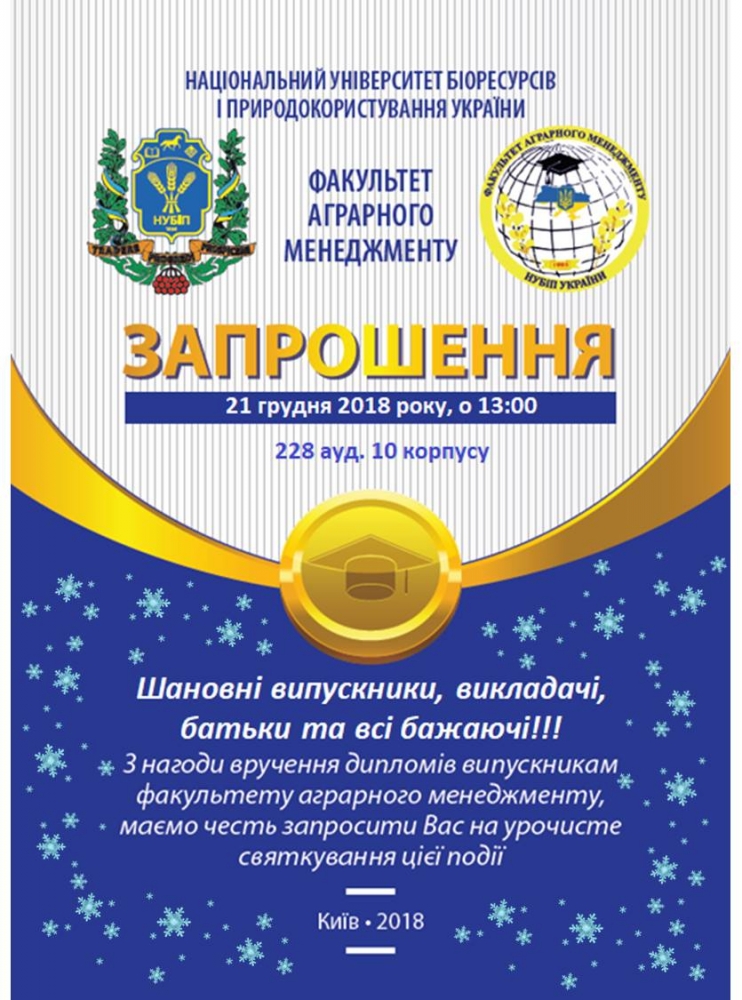 21 грудня 2018 року на факультеті аграрного менеджменту відбудеться випуск студентів ОС "Магістр" 20 грудня 2018 року 02:00 - 02:00