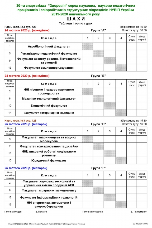 24 лютого 2020 року починаються змагання 30-ої спартакіади “Здоров’я” серед науково-педагогічних, наукових працівників і співробітників структурних підрозділів НУБіП України 2019-2020 н.р. з шахів