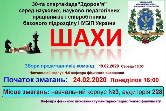 24 лютого 2020 року (понеділок) починаються змагання 30-ої спартакіади “Здоров’я” серед науково-педагогічних, наукових працівників і співробітників базового підрозділу НУБіП України 2019-2020 н.р. з шахів, 19 лютого відбудуться збори представників команд
