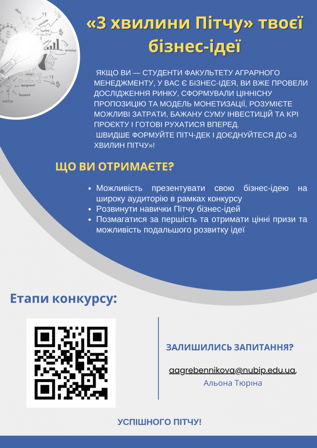 Якщо ви — студенти факультету аграрного менеджменту, у вас є бізнес-ідея, ви вже провели дослідження ринку, сформували ціннісну пропозицію та модель монетизації, розумієте можливі затрати, бажану суму інвестицій та KPI проєкту і готові рухатися вперед.