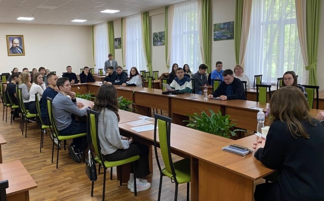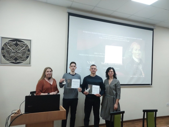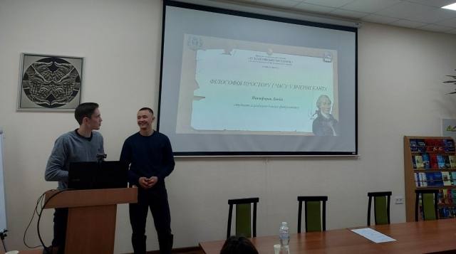 Даніїл Никифоров, Віктор Безносюк, студенти агробіологічного факультету презентувати доповідь «Філософія простору і часу у вченні І. Канта»