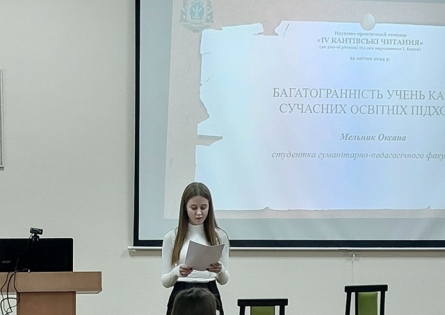 Цікаву та актуальну доповідь на тему «Багатогранність учень І. Канта у сучасних освітніх підходах» представила студентка гуманітарно-педагогічного факультету Оксана Мельник , акцентуючи увагу на важливості ідей філософа для сучасної педагогічної практики.