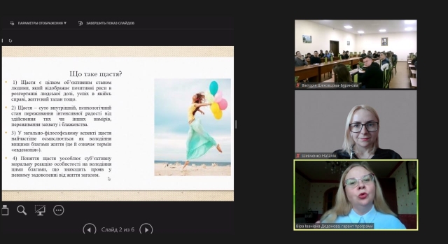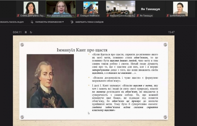 Професор кафедри філософії та міжнародної комунікації, доктор філософських наук Віра Додонова, виступила перед аудиторією з доповіддю «Поняття щастя у філософії І. Канта та Г. Сковороди: компаративний аналіз».