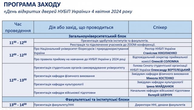 У програмі: вітальне слово та презентація університету від ректора Станіслава Ніколаєнка, інформація щодо особливостей вступної кампанії від відповідального секретаря приймальної комісії Олексія Соломки, знайомство із Сенатом студентської організації від її лідера Олександра Вертелецького, перевагами навчання, можливостями творчого і спортивного розвитку від завідувачів кафедри фізичного виховання Миколи Костенка, кафедри культурології Ірини Майданюк, кафедри військової підготовки Валерієм Шевчуком, прогулянка унікальною територією університету та багато іншого під час зустрічей на кожному факультеті та Навчально-науковому інституті, де будуть презентовані спеціальності та можна буде поставити запитання та отримати на них відповіді.
