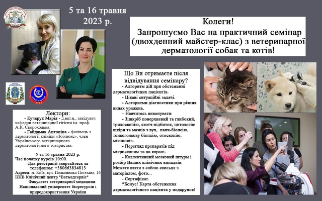5 та 16 травня 2023 відбудеться практичний семінар з ветеринарної дерматології собак та котів 1 травня 2023 року 03:00 - 03:00