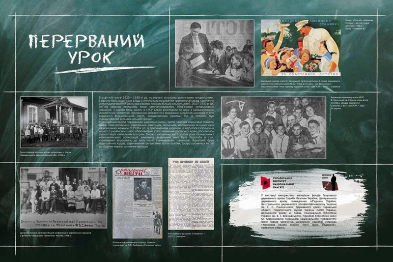 Окрім особистих історій, на стендах за допомогою архівних фотографії, плакатів, зображень підручників розгортається хроніка українського шкільного життя 1930-х – 1940-х років.