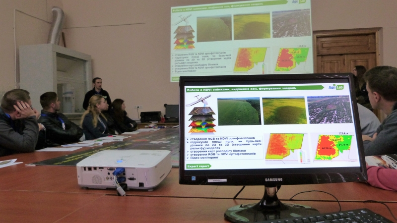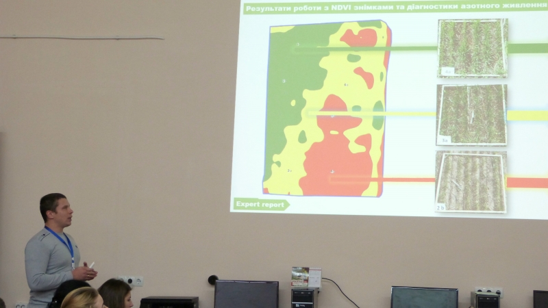 Теоретична сесія відбулася у лабораторії «Оптимізації живлення рослин», де разом із Володимиром Махотою (начальником відділу науково-технічного забезпечення компанії Agrilab) студенти розглянули періоди росту та розвитку пшениць, у які доцільно проводити моніторинг посівів, дізнались про джерела безкоштовних та платних знімків NDVI і їх якість. Володимир Анатолійович допоміг майбутнім фахівцям із агрохімії детально розібратись у створенні карт розподілу вегетативної маси рослин та із можливими шляхами ефективного використання цієї інформації. Крім того, студенти дізнались про сучасні інструменти й способи обліку густоти стояння рослин.