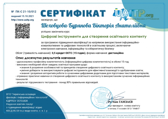 8 та 9 жовтня аспірантка кафедри філософії та міжнародної комунікації Вікторія Шеховцова-Бурянова прослухала курс підвищення кваліфікації «Цифрові інструменти створення навчального контенту».