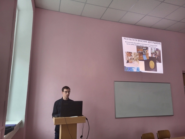 Третім доповідачем був здобувач 1 р.н. Роман Бердник. Тема дисертаційної роботи: «Роль карася сріблястого (китайського) Carassius auratus (Linnaeus, 1758) у формуванні промислової іхтіофауни спеціальних товарних рибничих господарств зони Лісостепу» науковий керівник доцент Петро Шевченко.