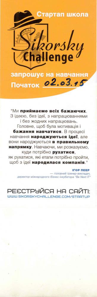 Національний технічний університет України «Київський політехнічний інститут» запрошує з 02.03.2015 р. на безкоштовне навчання у стартап школу Sikorsky challenge. Просимо забезпечити учать у стартапі одного студента від ННІ/факультету. Для цього необхідно до 27.02.2015 р. зареєструватися на сайті www.sikorskychallenge.com/startup.