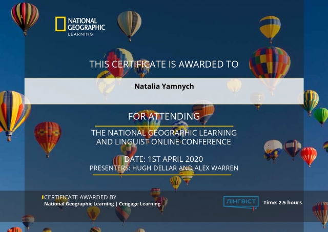 Карантин – це чудова можливість зайнятися самоосвітою та приділити увагу своєму професійному росту та розвитку. Старший викладач кафедри Ямнич Н. Ю. взяла участь у ряді онлайн вебінарів, конференцій та тренінгів. Варто відзначити конференцію “Double Impact on Your Teaching”, яка відбулася 1 квітня 2020 та була організована видавництвом National Geographic Learning та ексклюзивним представником National Geographic Learning в Україні компанією Лінгвіст. Одна із сесій конференції була присвячена використанню такого онлайн ресурсу як TED talks. Спікери поділилися власним досвідом ефективного використання ресурсу, дали корисні та цікаві рекомендації. А також учасники змогли на практиці побачити як можна застосовувати даний ресурс для навчання студентів 21 століття.