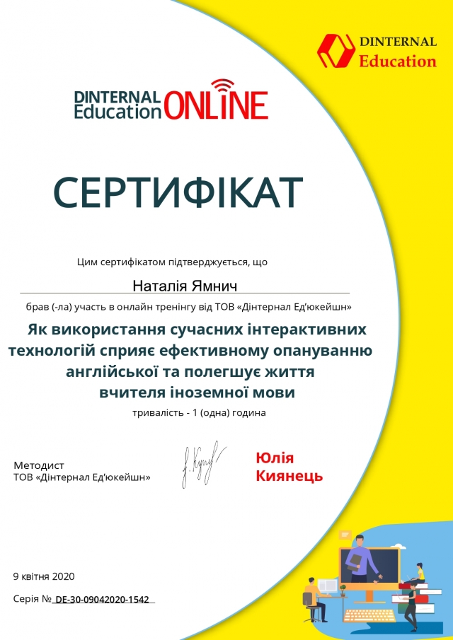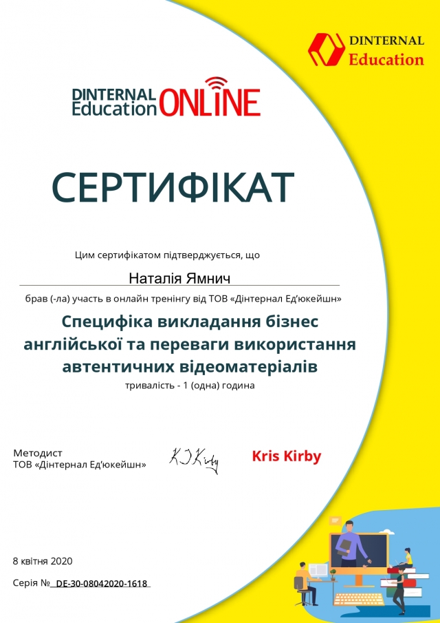 На сьогодні багато компаній пропонують широкий вибір онлайн платформ для навчання та викладання англійської мови. З поміж таких компанія Дінтернал Ед'юкейшн, з якою плідно співпрацює Ямнич Н. Ю. Враховуючи, яким неосяжним є обсяг інформації, яку доводиться опановувати викладачу сьогодні для організації навчального процесу за допомогою цифрових та онлайн ресурсів Команда Дінтернал Ед'юкейшн відкрила доступ до онлайн платформи MyEnglishLab для організації дистанційного навчання під час карантину. Багато студентів НУБіП приєдналися до цієї платформи та успішно удосконалюють свої вміння та навички, вивчаючи англійську мову. Щоб доcвід використання MyEnglishLab був максимально позитивним Дінтернал Ед'юкейшн організували ексклюзивний онлайн тренінг Effective teaching with MyEnglishLab – let’s learn how to MEL! для користувачів MyEnglishLab, який відбувся 22 квітня 2020, чим і скористалася Ямнич Н. Ю.