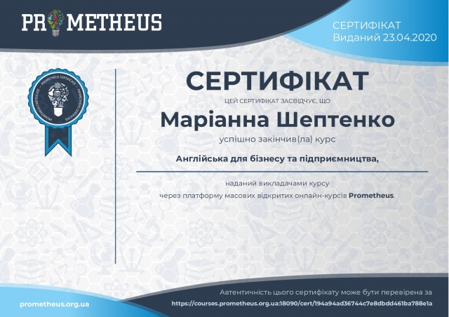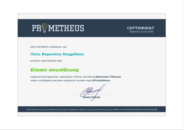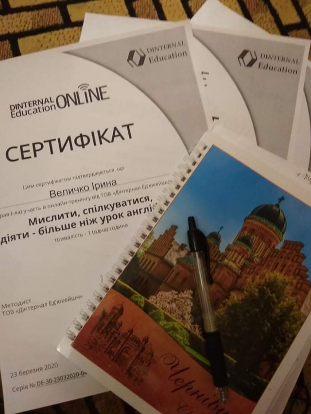 Викладач кафедри Величко І. Г. прослухала курс вебінарів від вітчизняних та іноземних методистів (Dinternal Education) та отримала сертифікати: "Мислити, спілкуватися, діяти-більш ніж урок англійської", "Розставляємо приоритети: лексична складова урока", "Ефективні методи досягнення кращих результатів при вивченні англійської мови дорослими слухачами".