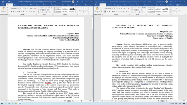Старший викладач Агапітова А. Ю. зосередилась на написанні наукових статей, зокрема проводилась робота за темами “English for Specific Purposes as Major Branch of English Language” та “Reading as a Primary Skill in Foreign Language Learning”. Тема викладання англійської для спеціальних цілей є особливо актуальною, оскільки робота викладача університету орієнтована на забезпечення студентів необхідними знаннями для майбутньої професійної діяльності. Згадана галузь викладання англійської мови дещо відрізняється від курсу загальної англійської. Це стосується самого змісту навчального матеріалу і відповідно методів викладання. Загальний рівень англійської мови студентів на початку курсу та володіння професійною лексикою та матеріалом на рідній мові безперечно має суттєвий вплив на кінцевий результат роботи і має враховуватись викладачем в процесі навчання.
