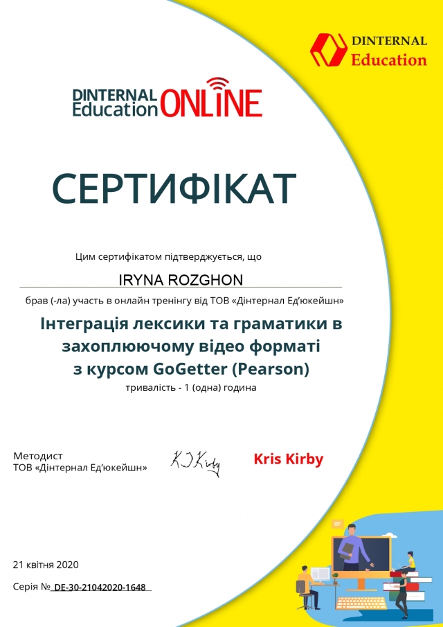 Серія вебінарів від Dinternal "Education bringing the real world to business English through video"; "Top Quality Teaching: Create a truly authentic learning environment and win your class over"; "What is Competency-Based Language Teaching All About?!; "Top Quality Teaching: Create a truly authentic learning environment and win your class over" дали змогу розглянути переваги й стратегії навчанню навичок ефективного засвоєння знань в процесі викладання іноземної мови. Професійний розвиток є важливим компонентом забезпечення виконання завдань: Blended learning: interactive technologies and digital resources in teaching English, – розглядалось питання змішаного навчання, яке має на увазі якісно новий підхід, який поєднує он-лайн навчання з традиційним та самостійним навчанням.