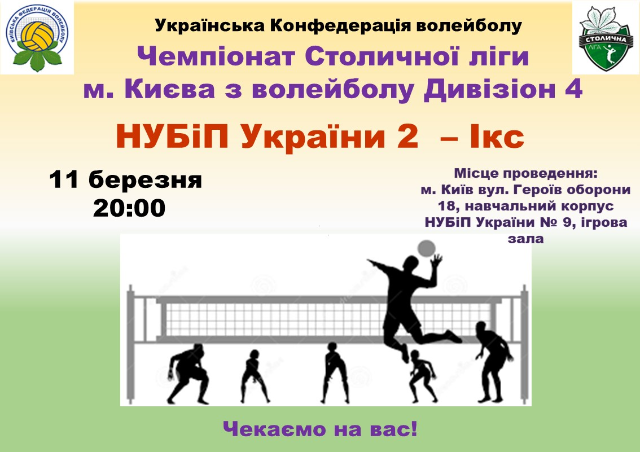 11 березня об 20:00 відбудуться гра-відповідь чергового туру змагань у четвертому дивізіоні Столичної ліги міста Києва з волейболу серед чоловічих команд. Студентська збірна НУБіП України-2 зустрінеться з командою Ікс.