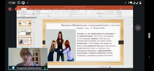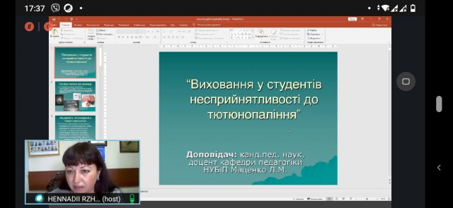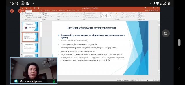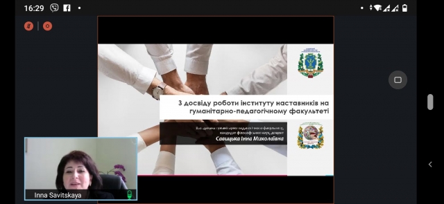 Наступна доповідь прозвучала від в.о. декана гуманітарно-педагогічного факультету Савицької Інни Миколаївни. Доповідачка поділилась досвідом роботи інституту наставників на гуманітарно-педагогічному факультеті, їх формами і методами виховної роботи. Доцент кафедри психології Мартинюк Ірина Анатоліївна ознайомила наставників із сучасними методиками розвитку згуртованості студентів. Доцент кафедри психології Омельченко Людмила Миколаївна розповіла про методи запобігання булінгу в студентських групах та причинами прояву агресії. Останньою на семінарі прозвучала доповідь від доцента кафедри педагогіки Маценко Лесі Миколаївни, яка хотіла привернути увагу наставників студентських груп до проблеми вживання наркотичних речовин та озброїти їх сучасними методиками профілактики наркотичної залежності.