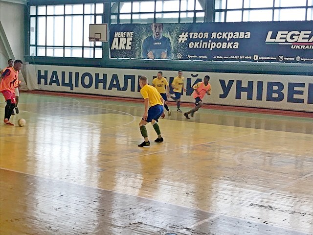 Дещо гірше склалася ситуація з командою КНУ. Довго рахунок лишався нічийним 1:1 при рівній грі, але прикрий рикошет від нашого захисника вивів суперників вперед. Наші хлопці, намагаючись відігратися, замінили воротаря на п’ятого польового гравця і «притисли» суперника до власних воріт. Швидко розігрували зайвого гравця, виводячи Олега Ставничого (ф-т аграрного менеджменту) під удар, і тільки вдалі дії воротаря-шевченківця та його удар у порожні ворота нашої команди звели нанівець всі зусилля зрівняти рахунок. Гра завершилася з рахунком 3:1 на користь збірної КНУ, і у підсумку збірна НУБіП України посіла друге місце.