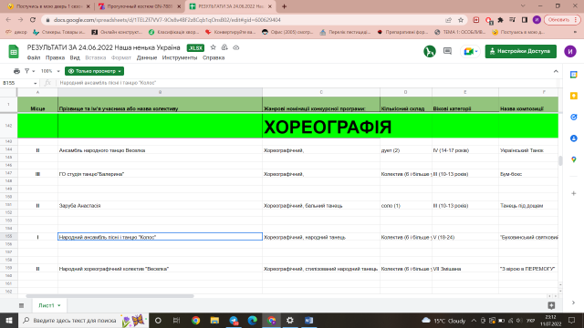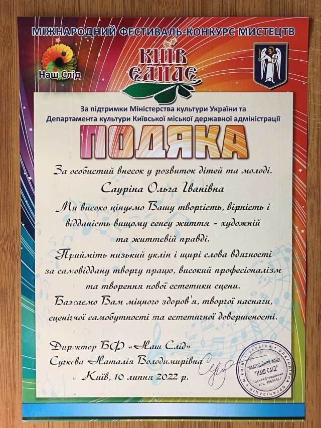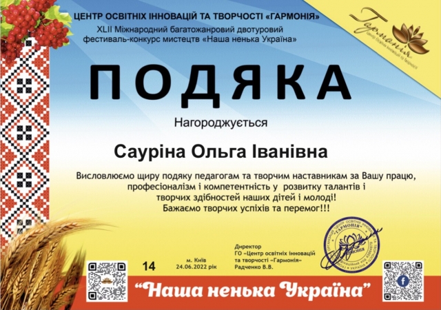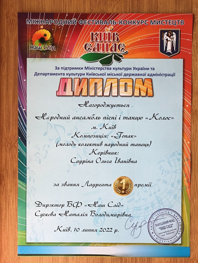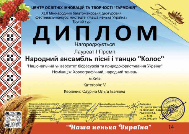 У такий складний для нашої країни і для кожного з нас воєнний час усі розуміють, наскільки важливо розповідати світові правду про нашу державу, поширювати її історію та культуру. Тож учасники хорелграфічної групи народного ансамблю пісню і танцю «Колос» вирішили: продовжуватимуть нести у світ красу українського танцю – перлини культури, не залишатимуть можливості розвивати свій талант, щоб представляти Україну на міжнародних заходах, піднімати національний дух і робити свій вклад у майбутню перемогу в жахливій війні. Дівчата і хлопці під керівництвом старшого викладача кафедри культурології Ольги Сауріної у всіх містах і селах, в Україні і за кордоном, де їм довелося переховуватися від бомбардувань і ракетних ударів, несли код народного танцю, представляючи «Колос» і НУБіП України – і їх помітили організатори ХLІІ-го Міжнародного багатожанрового фестивалю-конкурсу мистецтв “Наша ненька Україна”. Результат конкурсу прийшов колосистам нещодавно: