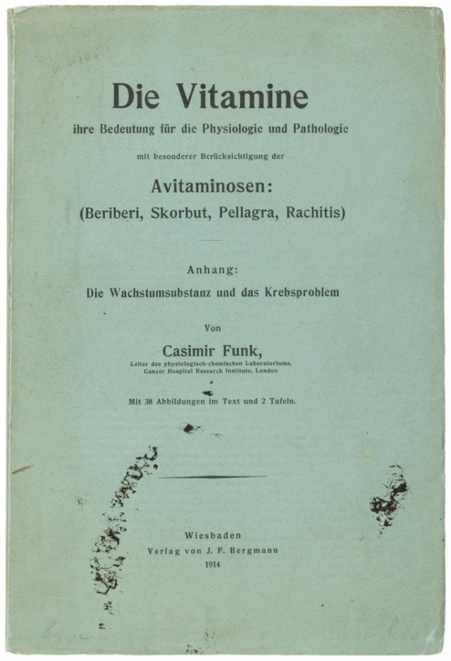Німецьке видавництво випускає книжку поляка «Die Vitamine» в 1914 році. В її бібліографії міститься 385 найменувань. Після закінчення Першої світової війни книга перекладається на кілька мов. В англійському виданні 1922 року налічується вже 1595 текстів-джерел.
