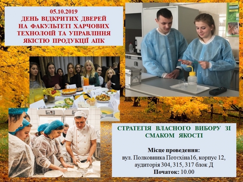 ДЕНЬ ВІДКРИТИХ ДВЕРЕЙ НА ФАКУЛЬТЕТІ ХАРЧОВИХ ТЕХНОЛОГІЙ ТА УПРАВЛІННЯ ЯКІСТЮ ПРОДУКЦІЇ АПК 4 жовтня 2019 року 14:52 - 14:52