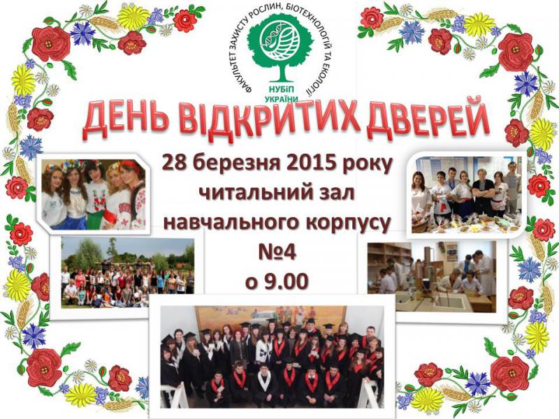 ДЕНЬ ВІДКРИТИХ ДВЕРЕЙ НА ФАКУЛЬТЕТІ ЗАХИСТУ РОСЛИН, БІОТЕХНОЛОГІЙ ТА ЕКОЛОГІЇ Адміністрація факультету ЗРБтаЕ 28 березня 2015 року 11:00 - 11:00