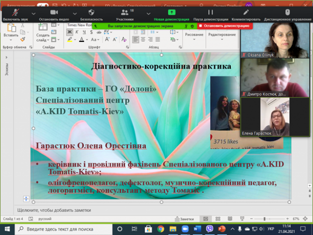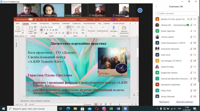 21 квітня 2021 року в ході навчальної (діагностико-корекційної) практики в нас відбулася он-лайн зустріч із музично-корекційним педагогом, олігофренопедагогом, дефектологом, логоритмістом, консультантом методу Томатіс, провідним спеціалістом центру A.KID "Tomatis-Kiev" Гарастюк Оленою Орестівною. Під час зустрічі вся студентська група мала можливість познайомитися з особливостями Tomatis-терапії, нам розповіли про її переваги та специфіку, показали спеціальне обладнання (навушники), що застосовують у цьому методі.