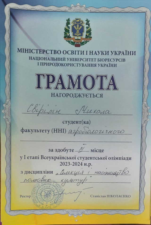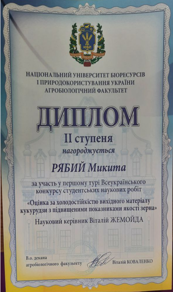 Проведено I етап Всеукраїнського конкурсу студентських наукових робіт на агробіологічному факультеті, в якому прийняв участь та зайняв 2 місце гуртківець Микита Рябий. Тема наукової роботи - «Оцінка за холодостійкістю вихідного матеріалу кукурудзи з підвищеними показниками якості зерна» з галузі знань «Агрономія».