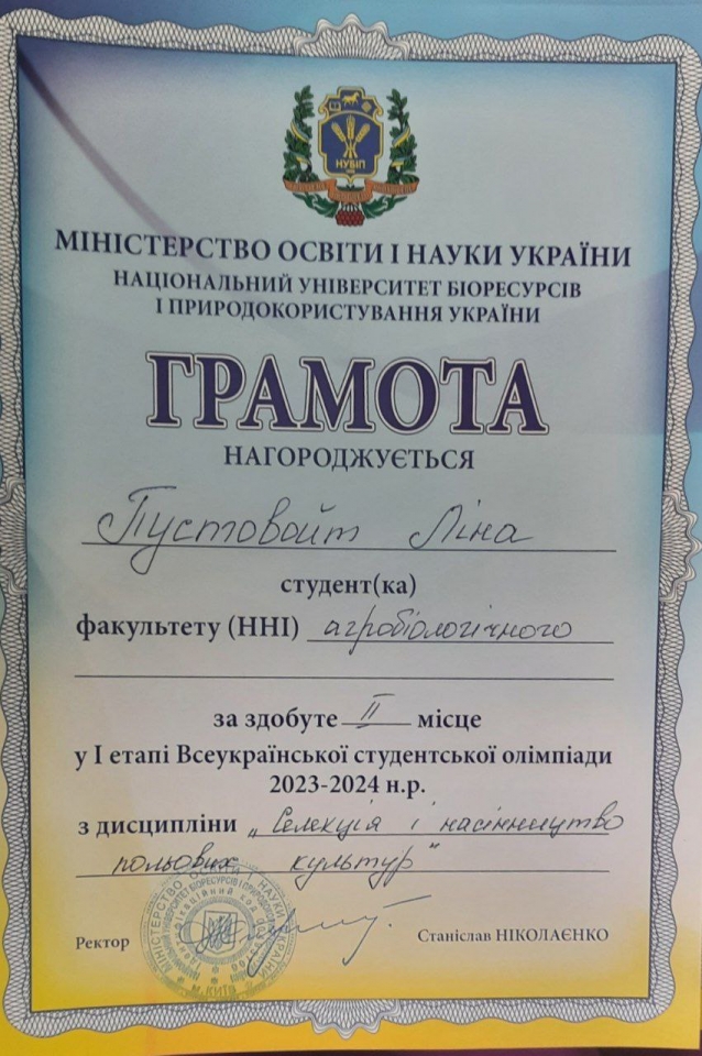 Проведено I етап Всеукраїнського конкурсу студентських наукових робіт, в якому приймала участь староста гуртку Омельчук Світлана науковий керівник – д. с.-г. н. Ковалишина Г.М. з науковою роботою «Оптимізація методики прискореної передачі цінних господарських ознак у батьківські компоненти гібридів ріпаку ярого» з галузі знань «Агрономія» і отримала 2 місце, отримавши 97 балів!