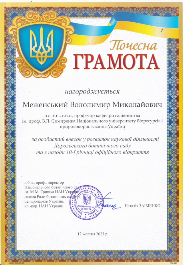 Науковці НУБіП України тісно співпрацюють з фахівцями молодої установи надаючи консультативну та матеріальну допомогу у формування колекцій плодових дерев та кущів. У порядку обміну цінні зразки насінного та вегетативного матеріалу мигдалю, хурми та зизифи з Хорольського ботанічного саду залучено для розширення колекцій в НУБіП України.