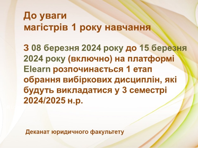 До уваги магістрів 1 року навчання: обрання вибіркових дисциплін на 2024/2025 н.р.! Normal 0 false false false EN-US X-NONE X-NONE Форма для вибору - перейти 8 березня 2024 року 02:00 - 02:00