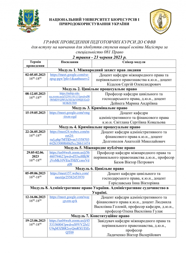 До уваги студентів 4 курсу! Графік проведення підготовчих курсів до ЄФВВ для вступу на навчання для здобуття ступеня вищої освіти Магістра за спеціальністю 081 Право Графік з активними посиланнями можна переглянути тут 1 травня 2023 року 03:00 - 03:00