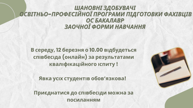 До уваги студентів 5 року навчання ОС Бакалавр заочної форми! Графік роботи ЕК https://meet.google.com/ivy-zvcr-ijb Секретар ЕК Юлія Канарик 7 березня 2025 року 02:00 - 02:00