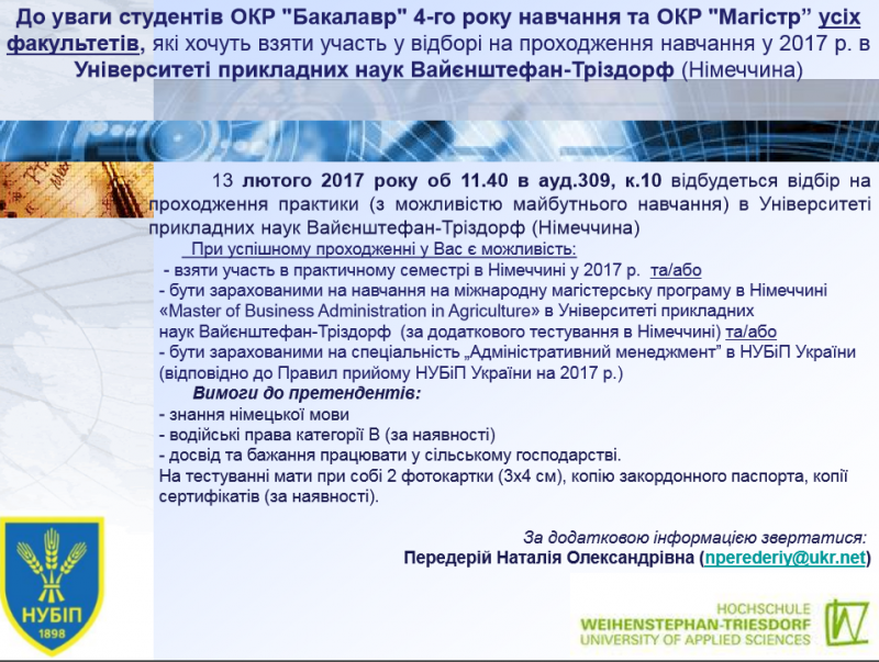 До уваги студентів, які хочуть взяти участь у відборі на проходження навчання у 2017 р. в Університеті прикладних наук Вайєнштефан-Тріздорф (Німеччина) 7 лютого 2017 року 02:00 - 02:00