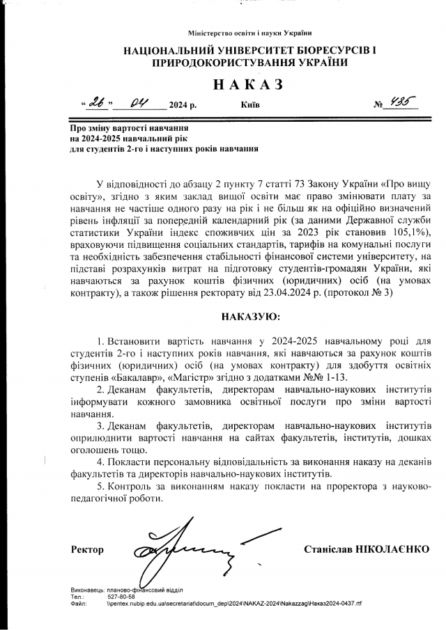 У відповідності до абзацу 2 пункту 7 статті 73 Закону України «Про вищу освіту», згідно з яким заклад вищої освіти мае право змінювати плату за навчання не частіше одного разу на рік i не більш як на офіційно визначений рівень інфляції за попередній календарний рік (за даними Державної служби статистики України індекс споживчих цін за 2023 рік становив 105,1 %), враховуючи пlдвищення соціальних стандартів, тарифів на комунальні послуги та необхідність забезпечення стабільності фінансової системи університету, на підставі розрахунків витрат на підготовку студентів-громадян України, які навчаються за рахунок коштів фізичних (юридичних) осіб (на умовах контракту), а також рішення ректорату від 23.04.2024 р. (протокол № 3) встановлена нова вартість навчання на 2024-2025 навчальний рік. Пропонуємо ознайомитися із наказом нижче.