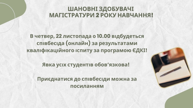 До уваги здобувачів магістратури 2 року навчання! Графік роботи ЕК https://meet.google.com/ivy-zvcr-ijb Секретар ЕК Юлія Канарик 17 листопада 2024 року 02:00 - 02:00