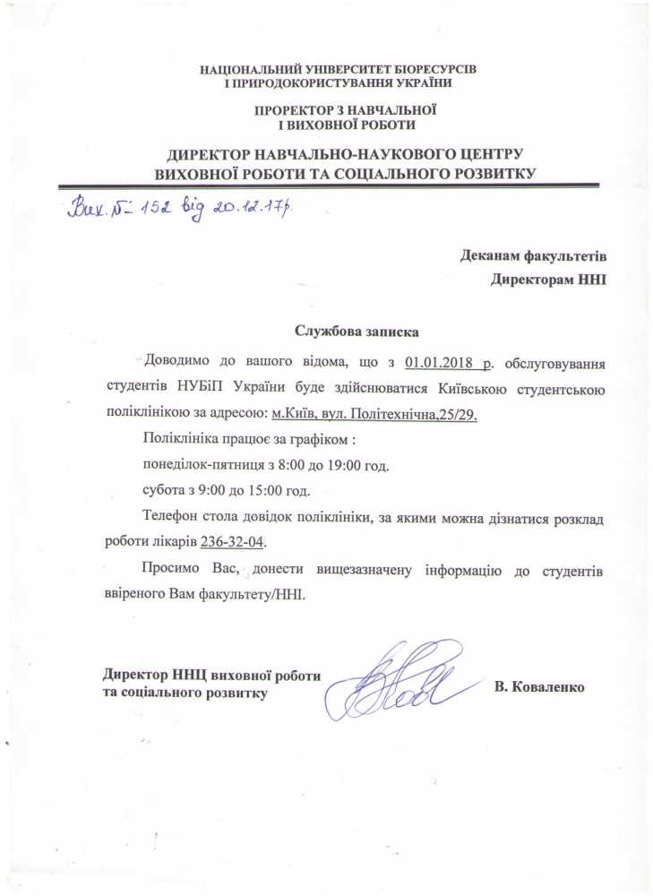 До відома студентів! Зміна місця медичного обслуговування студентів НУБіП України! 20 грудня 2017 року 02:00 - 02:00