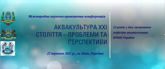 Факультет тваринництва та водних біоресурсів Національного університету біоресурсів і природокористування України запрошує науковців, студентів, магістрантів, аспірантів та рибоводів-практиків взяти участь у міжнародній науково-практичній онлайн-конференції «АКВАКУЛЬТУРА XXI СТОЛІТТЯ – ПРОБЛЕМИ ТА ПЕРСПЕКТИВИ», присвяченій 123-й річниці НУБіП України та 25-річчю з дня заснування кафедри аквакультури, яка відбудеться дистанційно 27 травня 2021 р.
