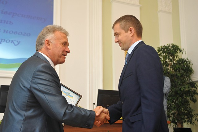 Фото 1. Ректор Ніколаєнко С.М. нагороджує Кононенка Р.В. Почесною грамотою університету