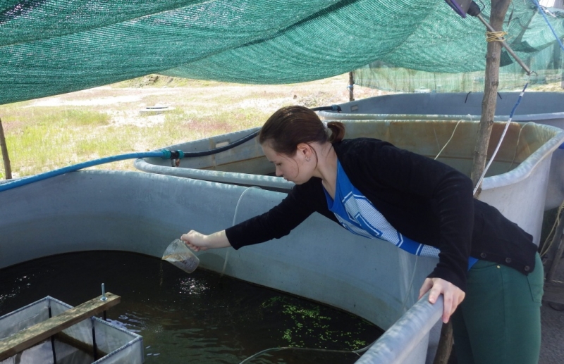 Фото 2. Аспірантка Гаріян Л.В. проводить годівлю личинок стерляді стартовим комбікормом