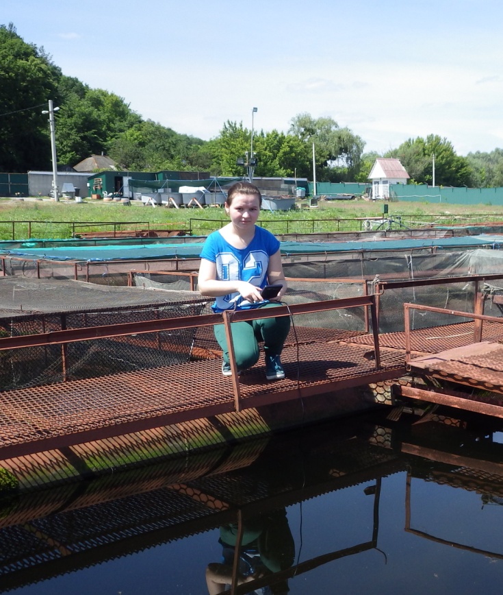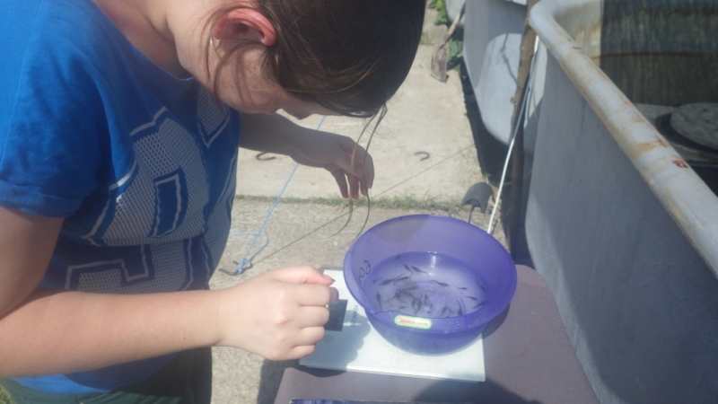Фото 4. Аспірантка Гаріян Людмила проводить дослідження динаміки росту мальків стерляді