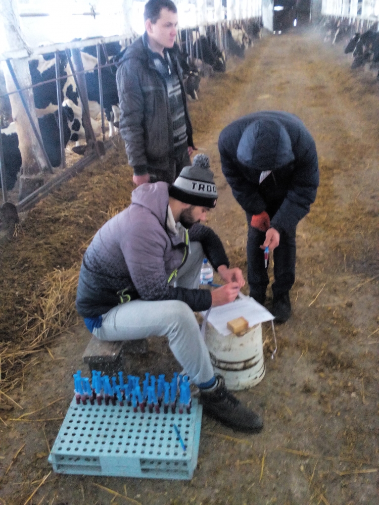 12 грудня згідно наказу №2529"С" від 8.12.17 "сильна половина" 3 курсу скороченого терміну навчання факультету ветеринарної медицини за супроводу викладачів кафедри епізоотології та організації ветеринарної справи: Жуковського М.О., Литвиненка В.М. провели відбір проб крові поголів’я ВРХ у ВП НУБіП України «Великоснітинське НДГ ім. О.В. Музиченка» для дослідження на лейкоз.